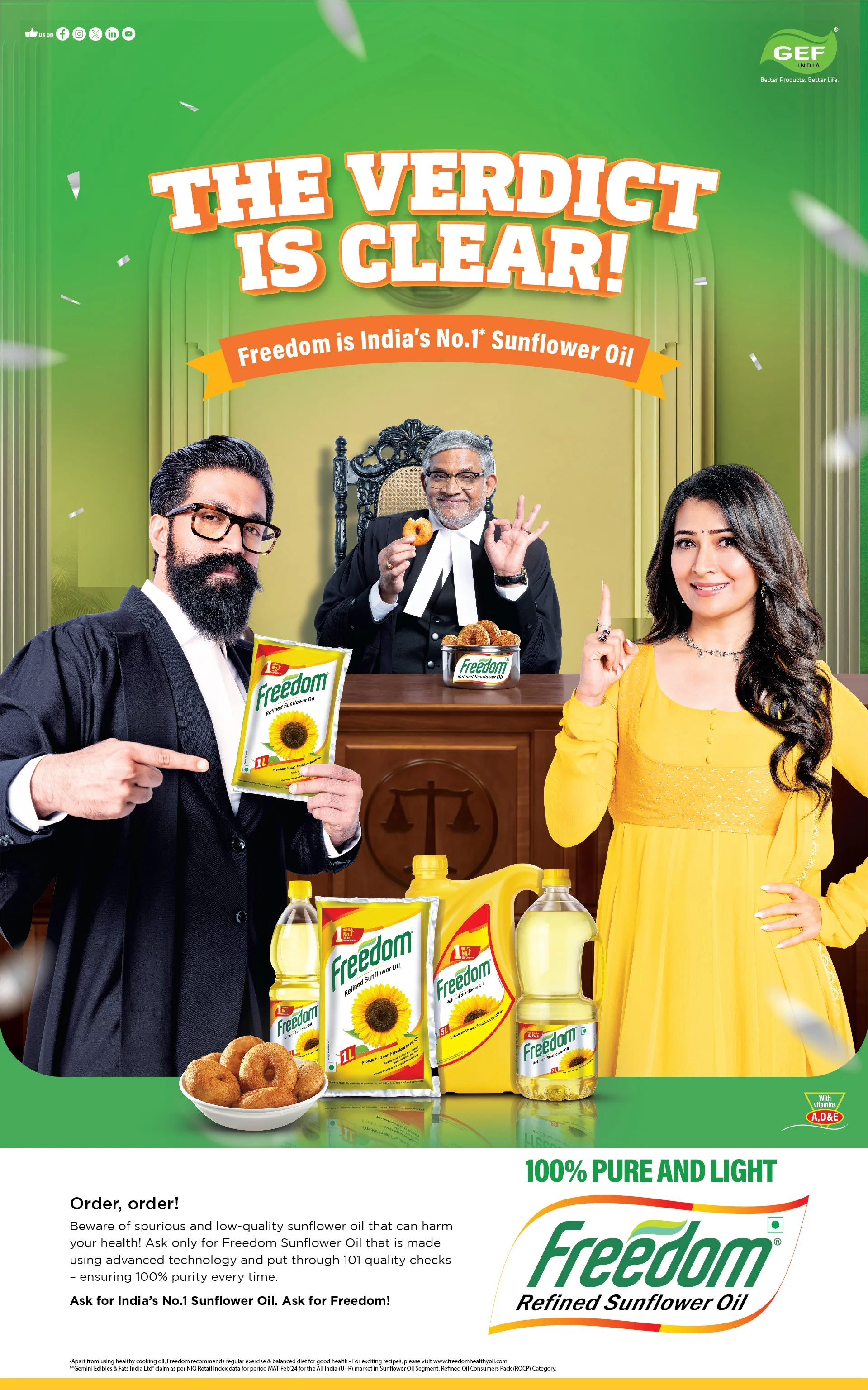 With Freedom’s growing popularity in Karnataka came a surge of copycat and counterfeit packs. This campaign, starring local Kannadiga hero Yash, combats that challenge while spotlighting Freedom as India’s No.1 selling sunflower oil - all with a refreshing break from the predictable kitchen scenes of typical cooking oil ads.